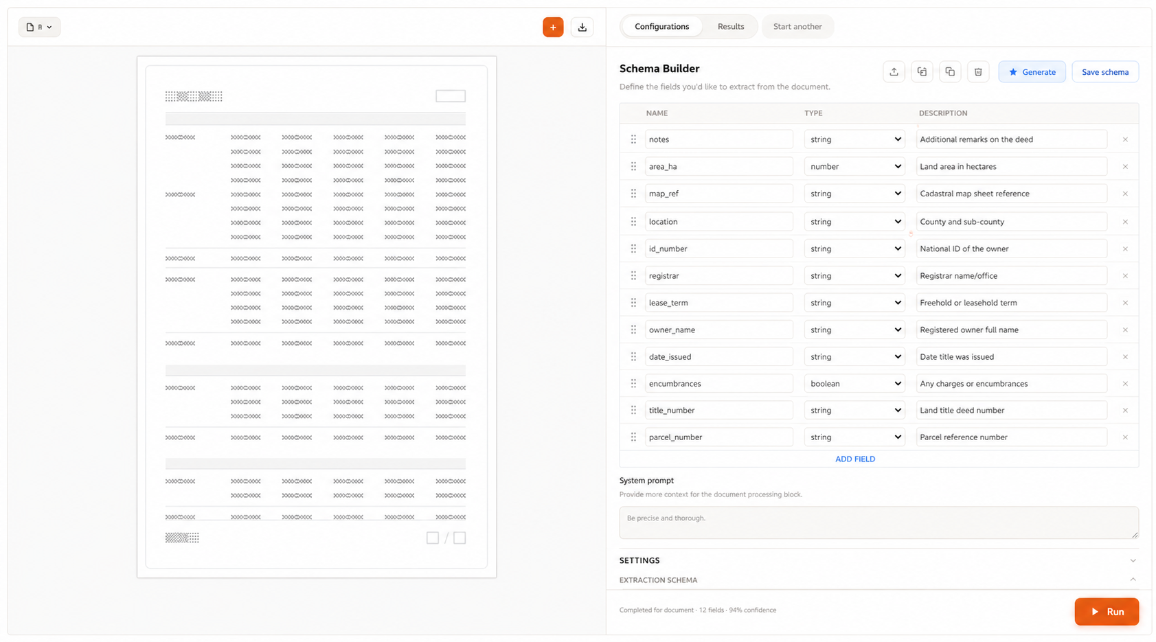 The schema library saved us weeks. We didn't have to explain our fields to the AI โ we just told it what to extract and it understood immediately.